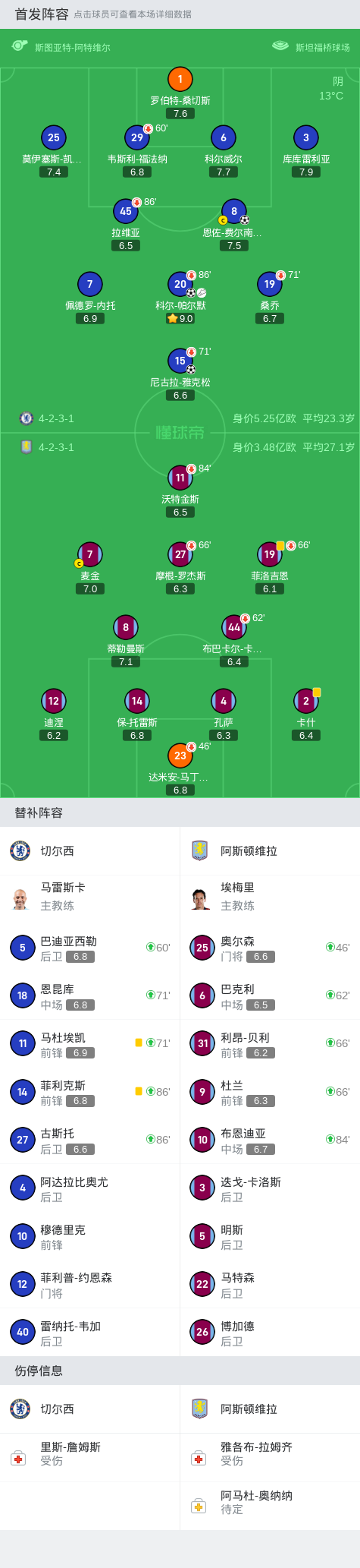 第46分钟,维拉中场换人,大马丁伤退,奥尔森登场