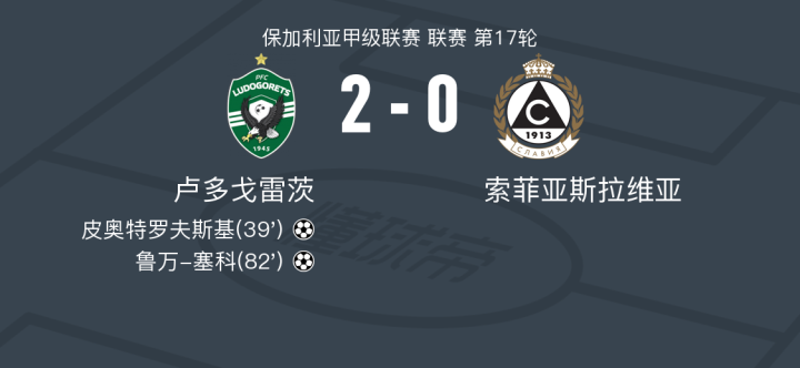 卢多戈雷茨2-0索菲亚斯拉维亚,皮奥特罗夫斯基破门,鲁万-塞科锁定胜局