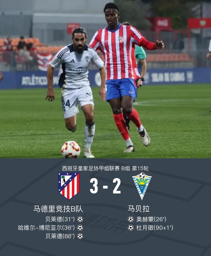 在西班牙皇家足协甲组联赛B组第15轮的比赛中,马德里竞技B队坐镇主场迎战马贝拉。比赛中,马贝拉的奥赫蒙率先为球队取得进球。随后,马德里竞技B队的贝莱德迅速扳平比分,并在比赛中再次取得进球,展现了出色的个人表现。哈维尔-博尼亚尔也为马德里竞技B队贡献了一粒进球,帮助球队扩大领先优势。尽管马贝拉的杜月徵在比赛尾声阶段打入一球,但最终马德里竞技B队以3-2的比分战胜了马贝拉,取得了这场比赛的胜利。