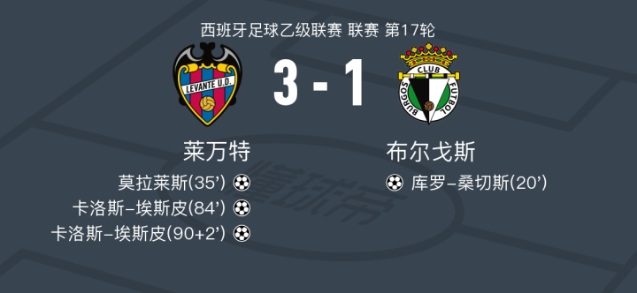 莱万特3-1逆转布尔戈斯,卡洛斯-埃斯皮两球,莫拉莱斯建功
