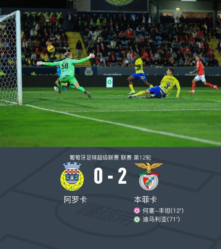 本菲卡2-0客胜阿罗卡,迪马利亚点射,何塞-丰坦自摆乌龙