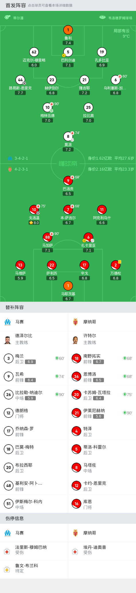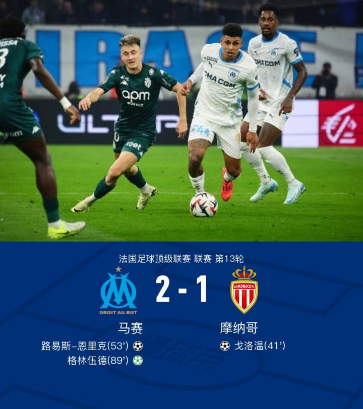 在法国足球顶级联赛第13轮的较量中,马赛坐镇主场迎战摩纳哥。上半场,戈洛温打破僵局。下半场,莫派助攻,路易斯-恩里克头球扳平比分。最后时刻,萨利苏手球送点,格林伍德一蹴而就。全场比赛结束,马赛主场2-1逆转击败摩纳哥。
