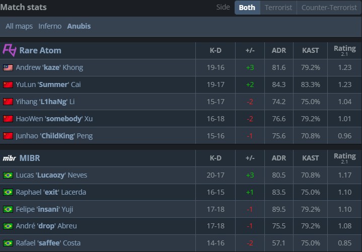 北京时间12月2日,CS2上海Major揭幕赛阶段瑞士轮,在1-2组中,RA 13-11 MIBR赢下图二阿努比斯,将总比分扳成1-1。