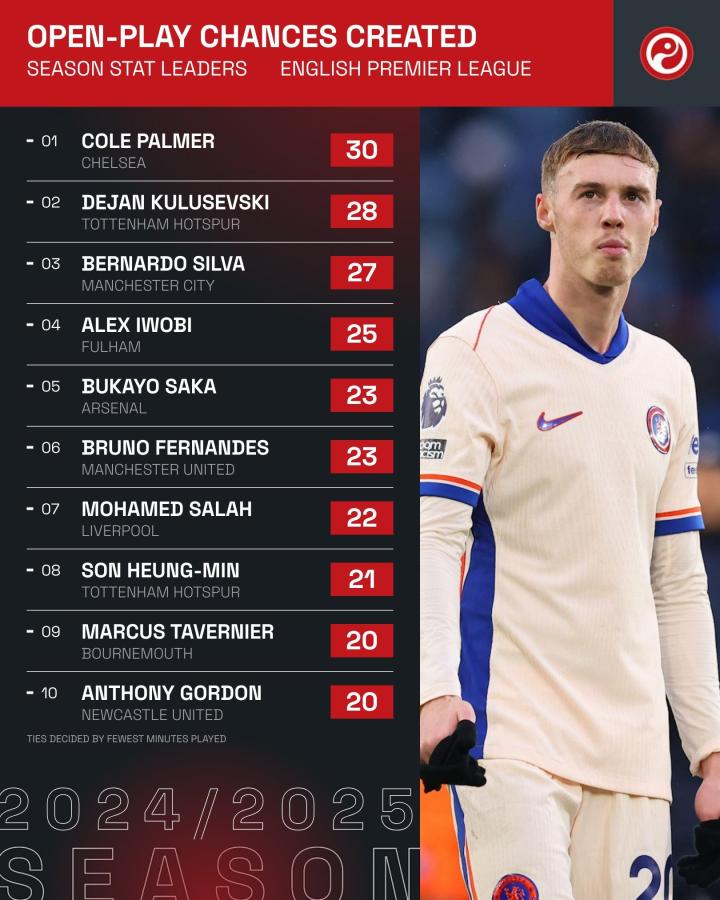 英超运动战创造机会排行榜:帕尔默居首,库卢、B席次之