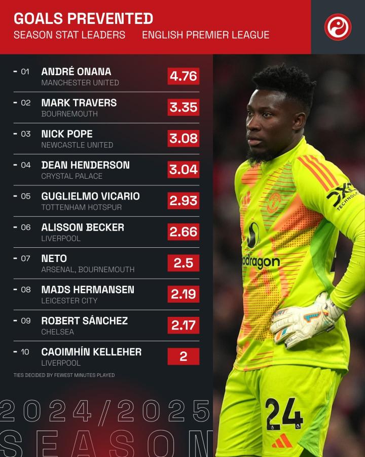据统计,曼联门将奥纳纳是本赛季英超联赛截至目前阻止预期进球数最多的门将。