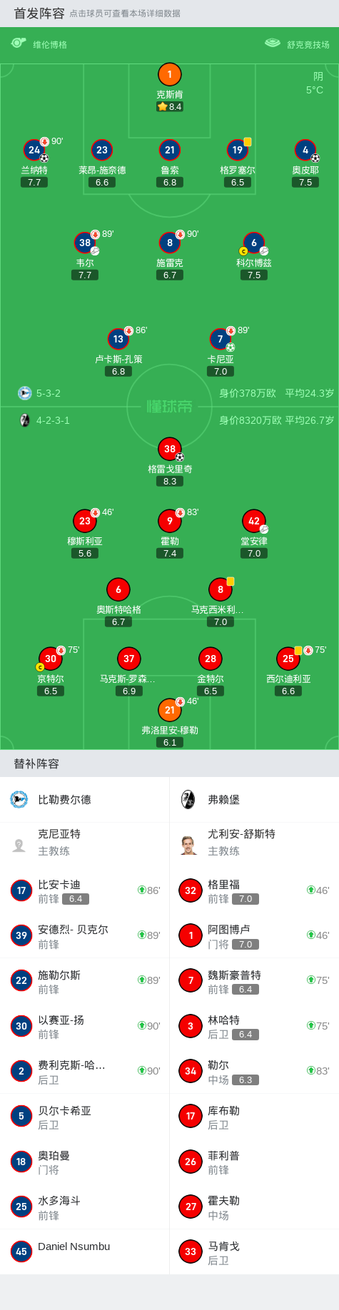 第63分钟,弗赖堡球员堂安律助攻格雷戈里奇打入一球。