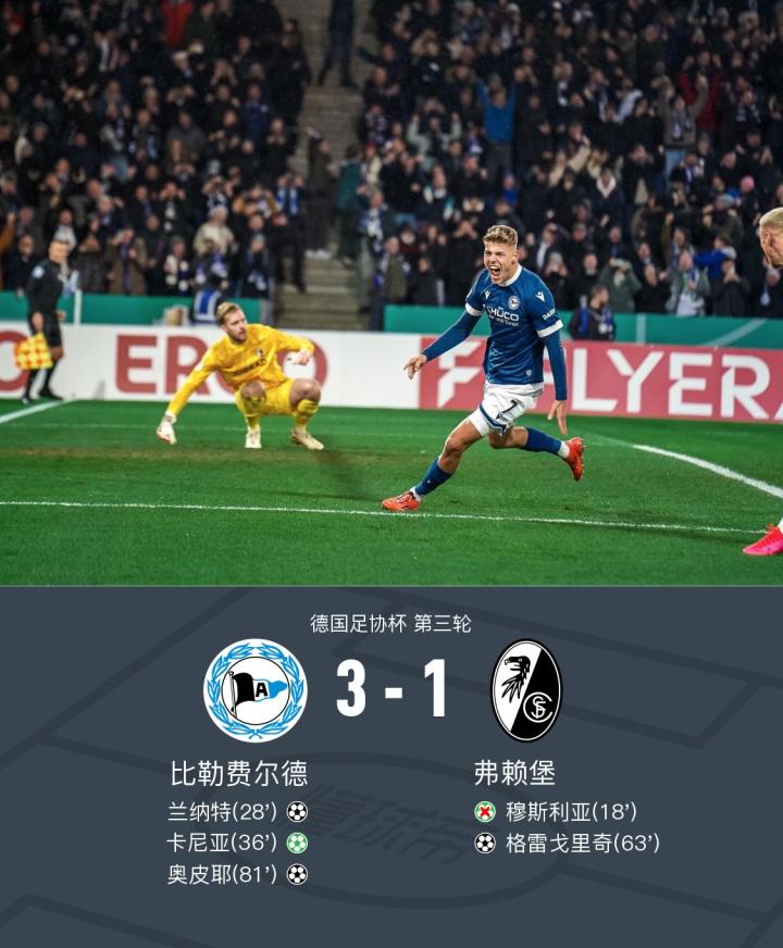 在德国足协杯第三轮的较量中,比勒费尔德迎战弗赖堡。比赛中,比勒费尔德展现了出色的进攻实力。首先,韦尔为兰纳特送出精妙助攻,帮助球队取得领先。随后,卡尼亚稳稳罚入点球,进一步扩大了比分优势。尽管弗赖堡通过堂安律的助攻,由格雷戈里奇扳回一城,但比勒费尔德并未放松。科尔博兹再次送出关键传球,助攻奥皮耶锁定胜局。最终,比勒费尔德以3-1战胜弗赖堡,成功晋级下一轮。
