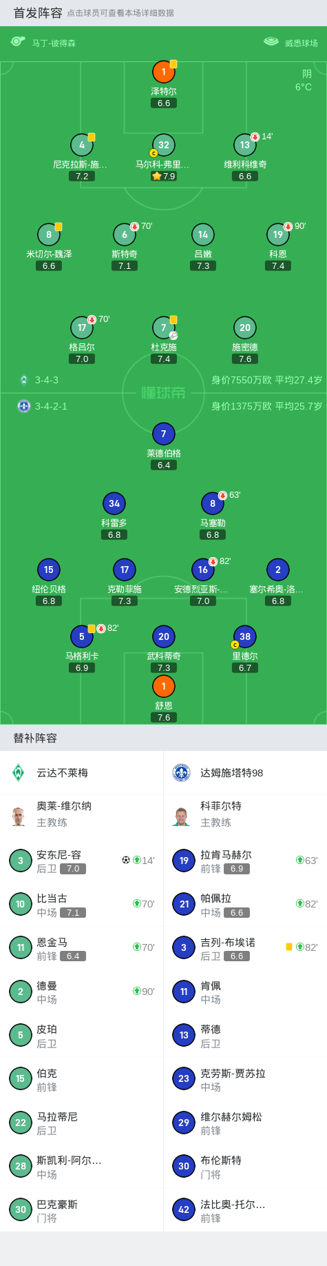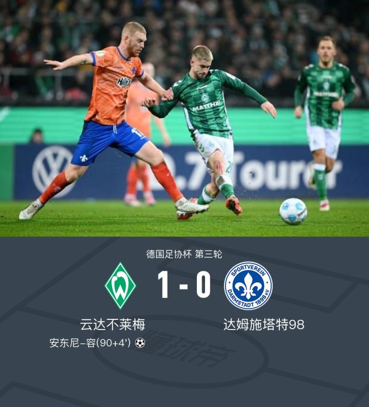 德国杯不莱梅1-0达姆施塔特晋级,安东尼-容绝杀,客队1射正