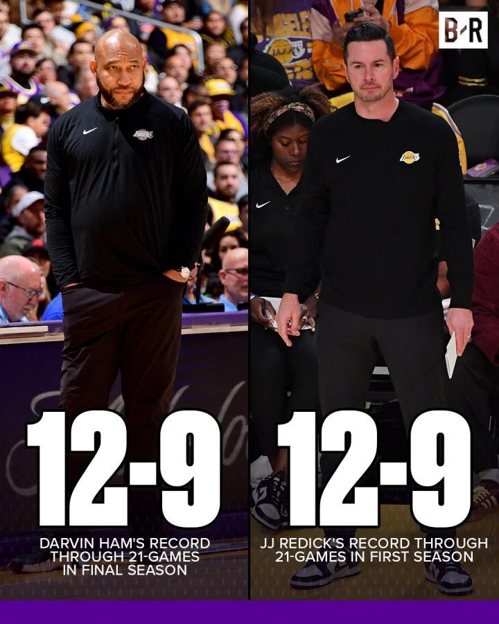 本赛季至今,在雷迪克执教的前21场比赛中,湖人队取得了12胜9负的战绩;而相对应的哈姆在上赛季前21场比赛中,也取得了12胜9负的战绩。