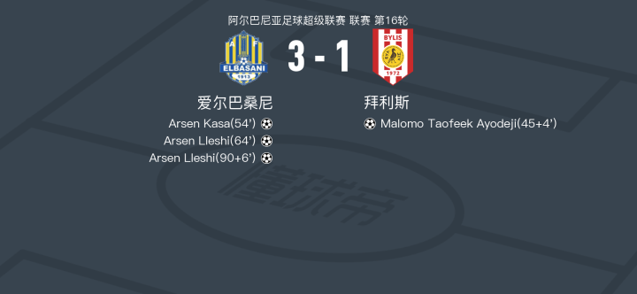 下半场补时第6分钟,爱尔巴桑尼球员Arsen Lleshi打入一球。