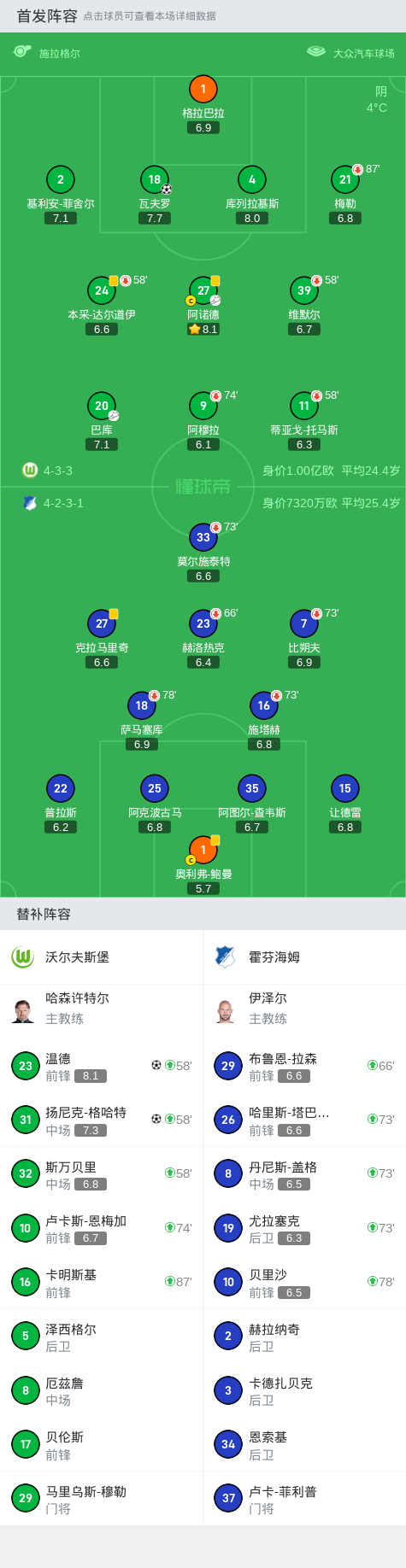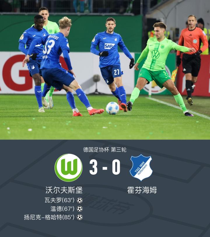 沃尔夫斯堡3-0霍芬海姆,瓦夫罗首开纪录,温德、扬尼克-格哈特建功