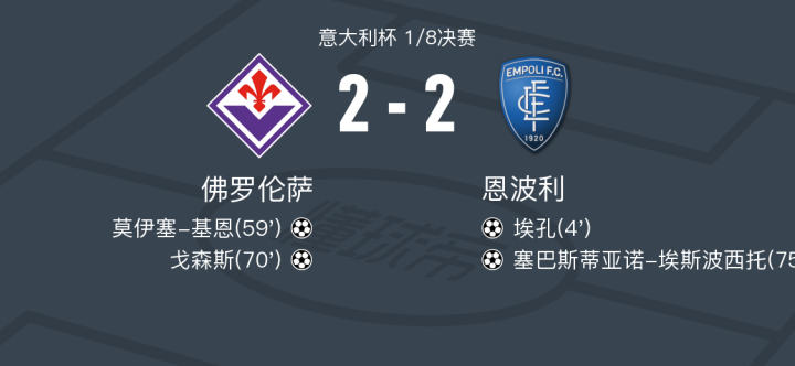 90分钟战报:佛罗伦萨2-2战平恩波利,双方进入点球大战