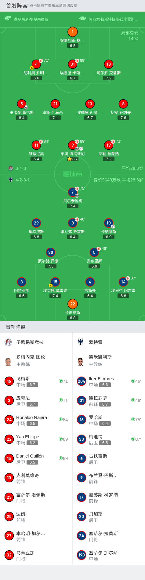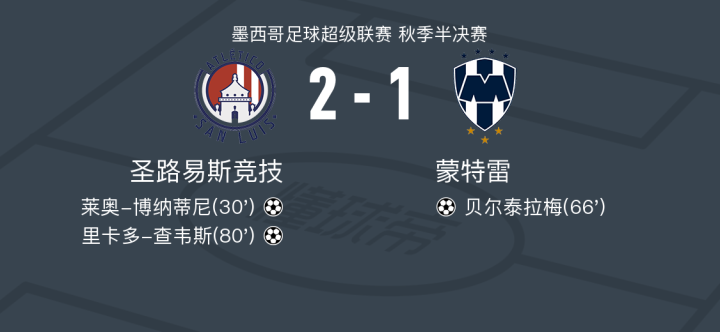 圣路易斯竞技2-1蒙特雷,里卡多-查韦斯破门,莱奥-博纳蒂尼建功