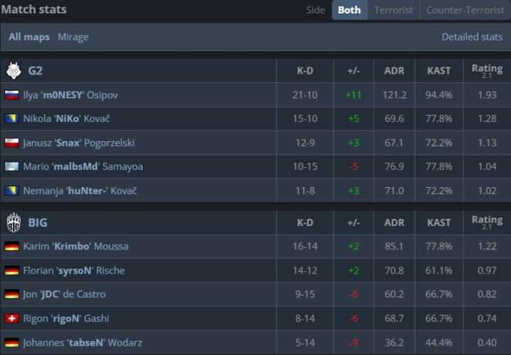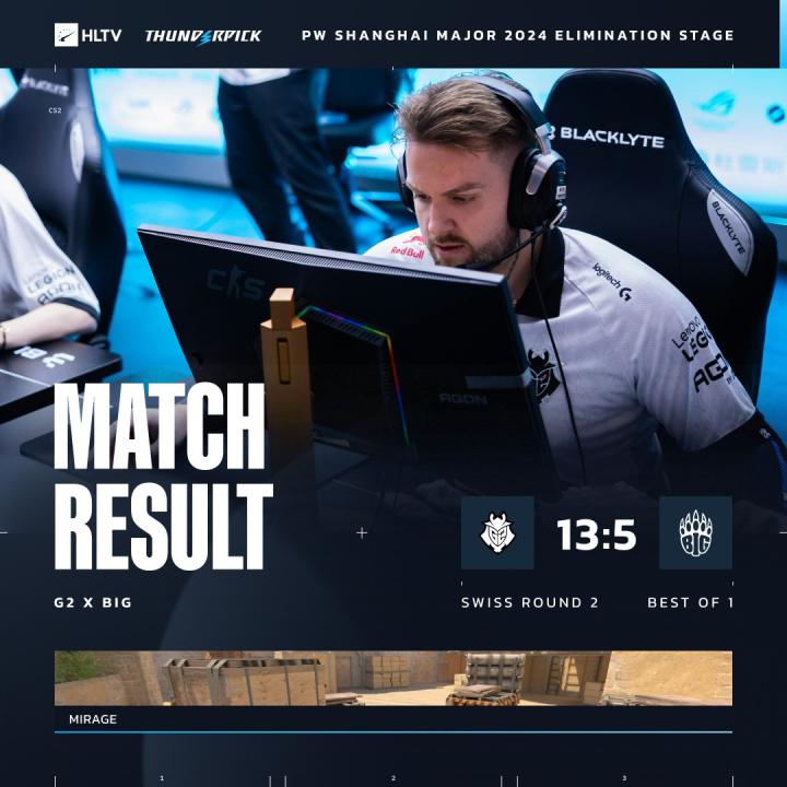 BIG拿到3-0领先后交出了比赛的主动权,NiKo在第5回合冷静完成1v2残局扭转战局。G2上半场连拿9分奠定优势,最终以13-5击败BIG轻松晋级1-1组。