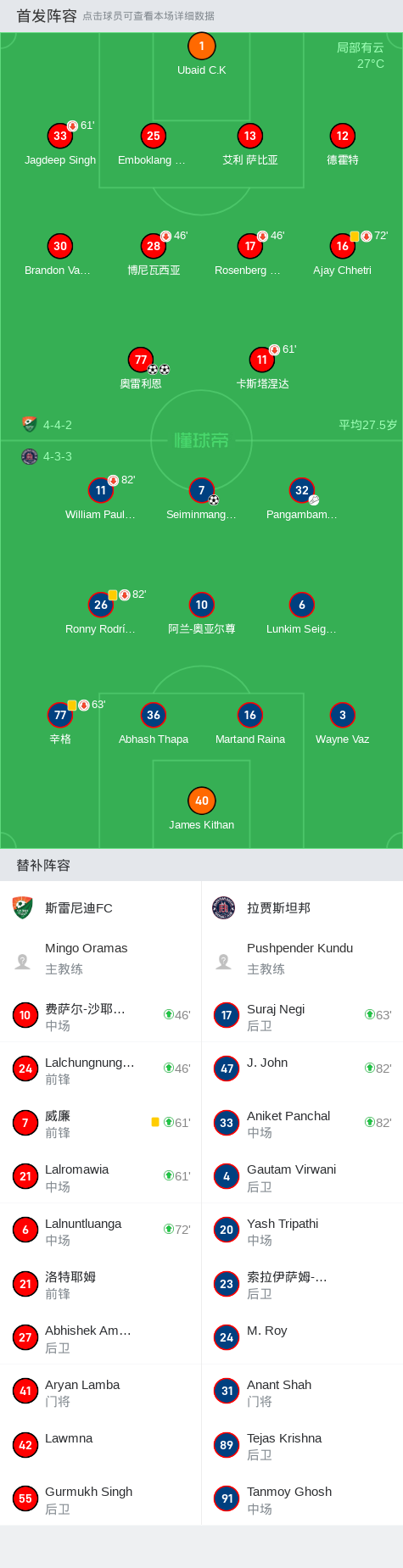 第57分钟,拉贾斯坦邦球员Pangambam Naoba Meitei助攻Seiminmang Manchong打入一球。
