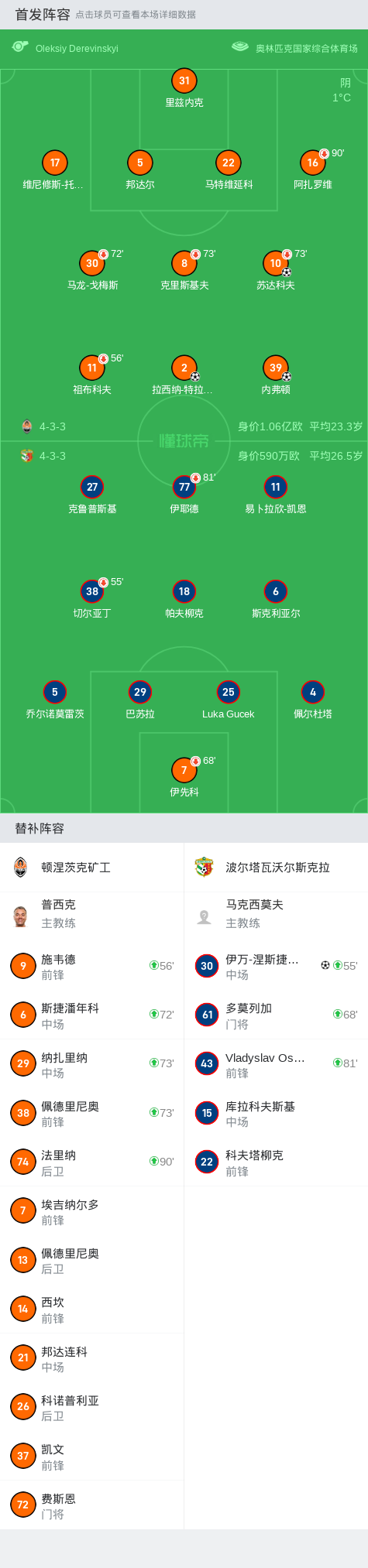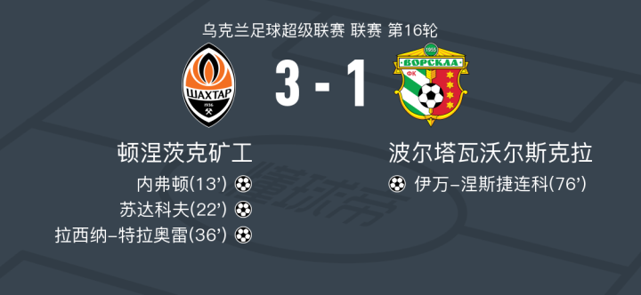 顿涅茨克矿工3-1波尔塔瓦沃尔斯克拉,拉西纳-特拉奥雷、苏达科夫破门