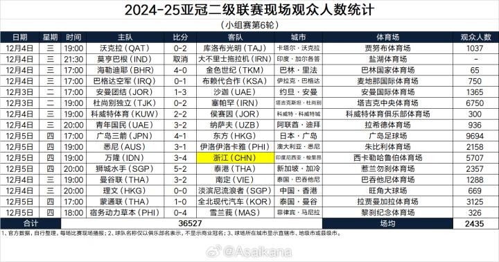 2024-25亚冠二级联赛现场观众人数统计(小组赛第6轮)