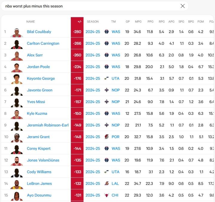 NBA至今正负值榜单:詹姆斯-132为湖人最低,全联盟排倒数第14尼古拉约基奇 @懂球帝2024-12-06 11:50据NBA数据网站statmuse统计,赛季至今,湖人队球星勒布朗-詹姆斯正负值为-132,为湖人队最低。此外,在NBA全联盟的正负值榜单中,詹姆斯排在倒数第14位,在他后面的球员全部来自东西部附加赛区之外的球队。本赛季,詹姆斯22场比赛全勤,场均出场34.8分钟,能够得到22.3分7.9篮板9.0助攻,投篮命中率49%,三分命中率34%,罚球命中率76%。展开更多