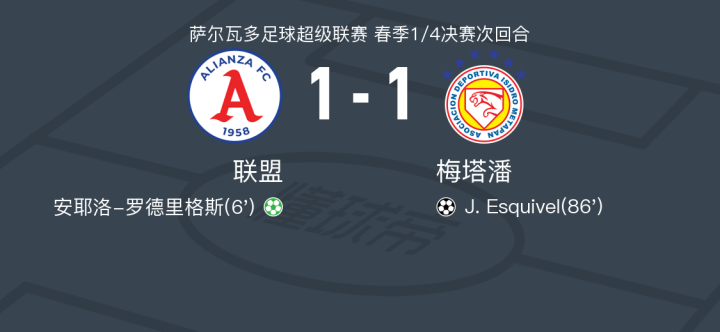 在萨尔瓦多足球超级联赛春季1/4决赛次回合的较量中,联盟队坐镇主场迎战梅塔潘队。比赛中,联盟队的安耶洛-罗德里格斯成功罚入点球,为球队取得领先。随后,梅塔潘队的J. Esquivel也为球队打入一球,将比分扳平。最终,双方以1-1握手言和,两回合总比分同样为1-1。