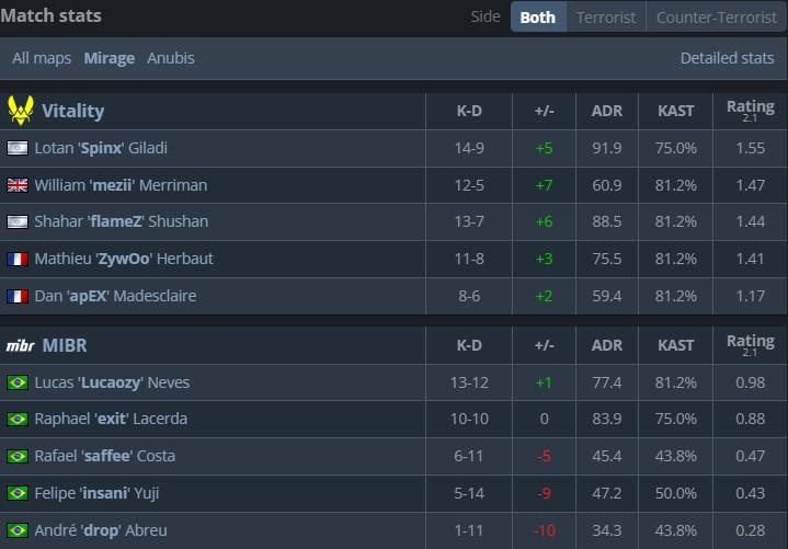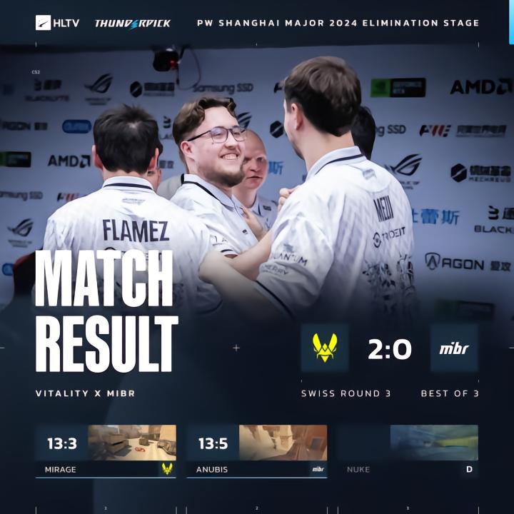 最终由ZywOo领衔的小蜜蜂轻松击败赛事黑马MIBR,两图仅让对手拿到8分,全面压制。以色列双雄、“奶粉战神”、大番薯轮番发力,助Vitality取得3胜0负晋级赛事八强。