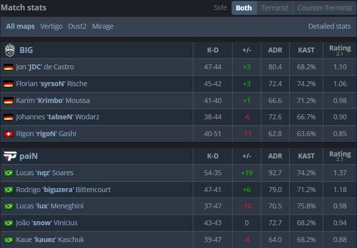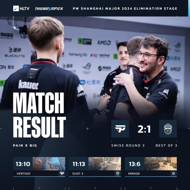 在同时进行的另一场BO3中,paiN艰难击败BIG送给对手第3负出局,paiN进入1-2组。