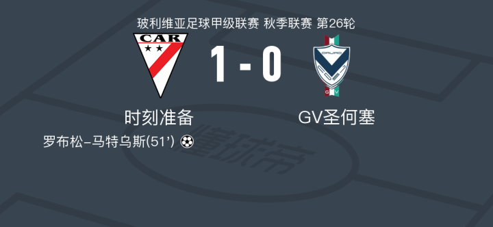 在玻利维亚足球甲级联赛秋季联赛第26轮的较量中,时刻准备队坐镇主场迎战GV圣何塞队。比赛中,时刻准备队的罗布松-马特乌斯在队友莫伊塞斯-帕尼亚瓜的精妙助攻下成功破门,为球队取得领先。最终,时刻准备队以1-0小胜GV圣何塞队,捍卫了主场荣耀。
