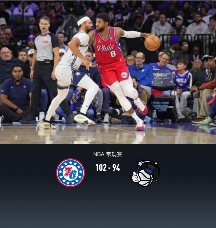 第四节76人保罗-乔治拿下9分,魔术萨格斯拿下15分,最终76人102-94战胜魔术