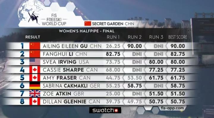 第三轮,谷爱凌在比赛前已经提前确定夺冠。另一位中国选手李方慧凭借第一轮拿到的82.75分获得亚军。