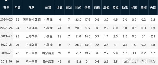 这位去年在上海久事仅场均9.6分3篮板1助攻的问题少年,今年各项数据都刷新了职业生涯新高,得分更是几乎翻了一番。如今场均17.9分的他,已经是高居本土球员得分榜第5名的存在。