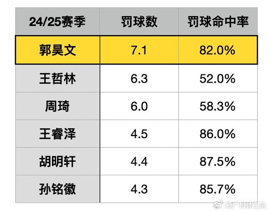 目前为止,郭昊文场均7.1次站上罚球线,不仅是本土球员最多,甚至比王哲林和周琦这两座巨塔都要多出一截。