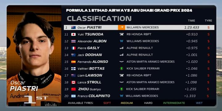 F1阿布扎比三练:皮亚斯特里领跑,维斯塔潘第4,周冠宇第19