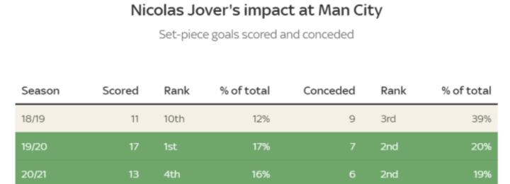 如下图,我们可以看到,在约弗于曼城工作期间,曼城的定位球影响力显著提升。
