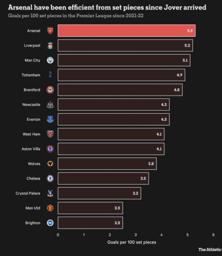 自2022-23赛季开始以来,阿森纳一直是英超联赛中最出色的定位球球队。枪手已经通过定位球打进了45个进球,值得注意的是,阿森纳在定位球方面非常高效,每100个定位球就能进5.3球。