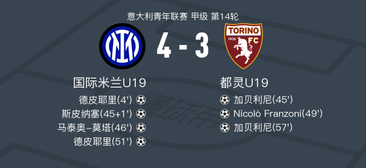 国际米兰U19 4-3都灵U19,德皮耶里双响,马泰奥-莫塔破门