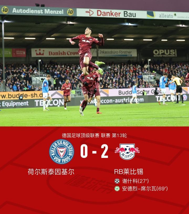 在德国足球顶级联赛第13轮的较量中,荷尔斯泰因基尔坐镇主场迎战RB莱比锡。比赛中,谢什科一条龙破门打破平衡;下半场,奥蓬达造点惹争议,安德烈-席尔瓦点射再下一城。最终,RB莱比锡以2比0战胜荷尔斯泰因基尔,终结了德甲4轮不胜。