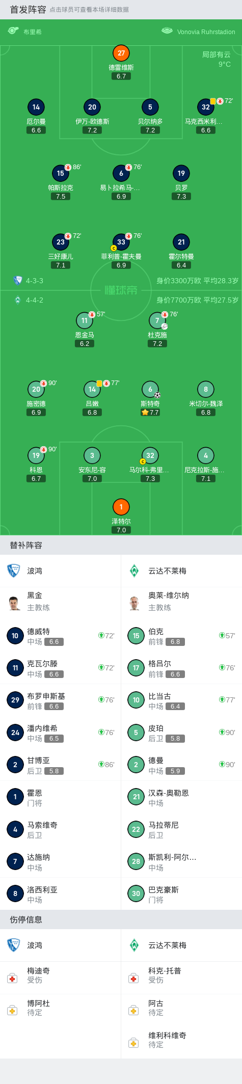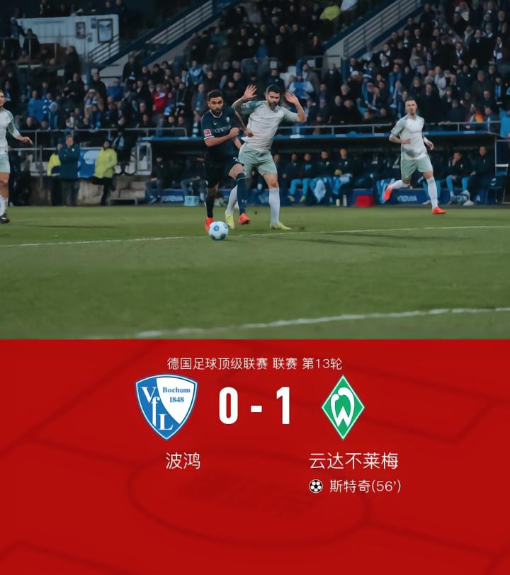 波鸿0-1云达不莱梅,斯特奇一击制胜,杜克施献助攻