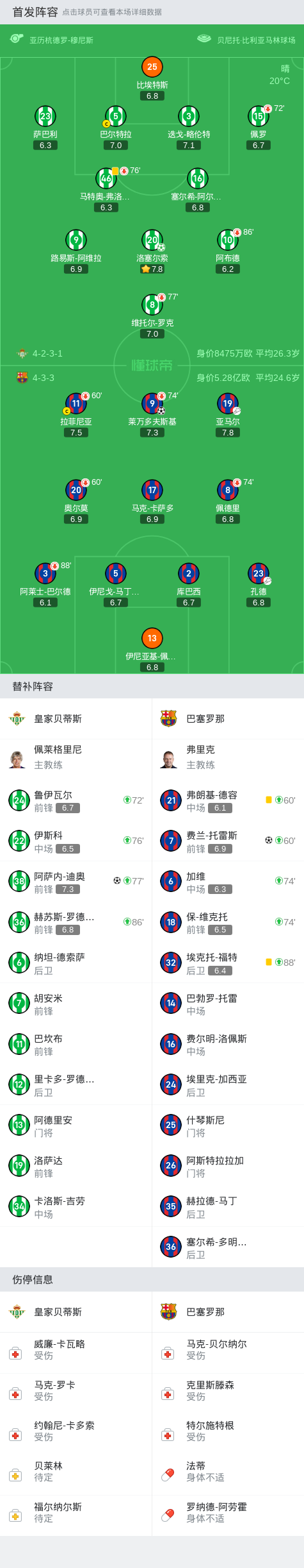 双方球员步入球场,贝蒂斯临时更换门将,比埃特斯首发出战