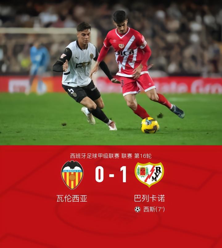 在西班牙足球甲级联赛第16轮的较量中,瓦伦西亚坐镇主场迎战巴列卡诺。比赛中,巴列卡诺的帕拉松送出精妙助攻,西斯抓住机会成功破门,为球队取得领先。最终,巴列卡诺凭借这一进球,以1比0小胜瓦伦西亚,客场全取三分。