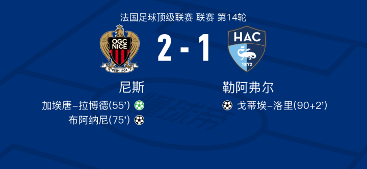 尼斯2-1勒阿弗尔,布阿纳尼破门,加埃唐-拉博德1传1射