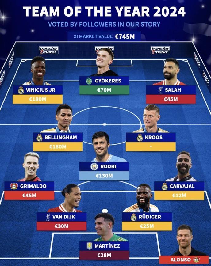 北京时间12月8日,德国转会市场列出了球迷评选的2024年年度最佳阵容。