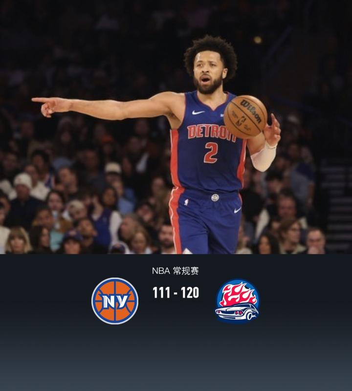 第四节尼克斯布伦森拿下7分,活塞杰伦-杜伦拿下8分,最终尼克斯111-120不敌活塞