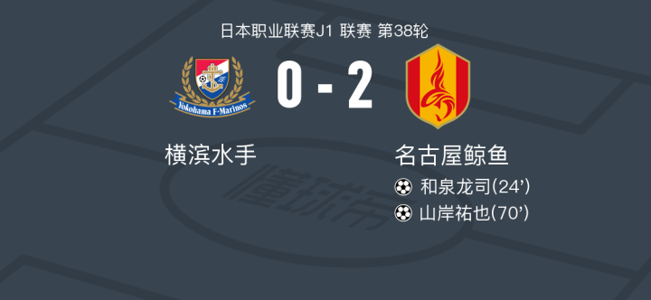 在日本职业联赛J1联赛第38轮的比赛中,横滨水手坐镇主场迎战名古屋鲸鱼。比赛中,名古屋鲸鱼的和泉龙司率先为球队打开局面,随后山岸祐也再下一城,帮助球队扩大领先优势。最终,名古屋鲸鱼以2比0战胜横滨水手,取得了本场比赛的胜利。