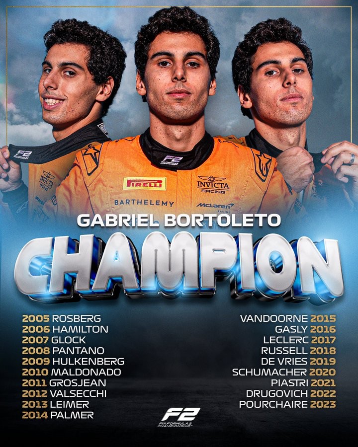 北京时间12月8日,在刚刚结束的F2阿布扎比大奖赛后,迈凯伦青训车手加布里埃尔-博托莱托加冕F2车手总冠军,同时其所在的Invicta Racing获得车队总冠军。博托莱托也将成为继迈凯轮车手皮亚斯特里后,又一位以新秀车手的身份加冕F3、F2总冠军并进入F1完成“三连跳”的车手。