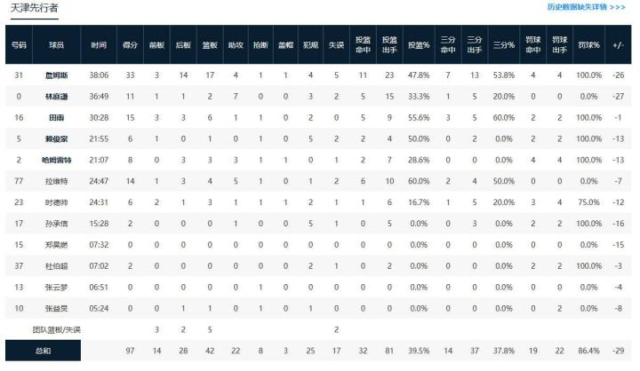 天津先行者大卫-詹姆斯33分17板4助1断1帽,田雨15分6板1助1断,马库斯-拉维特14分4板5助1断。