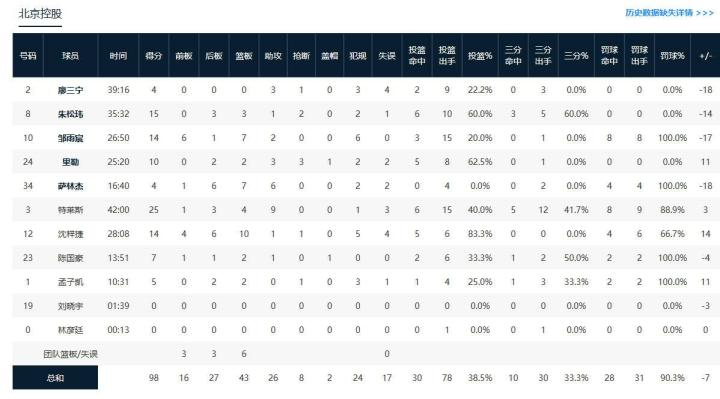 北京控股特拉维斯25分4板9助,朱松玮15分3板1助1断,沈梓捷14分8板1助1断;