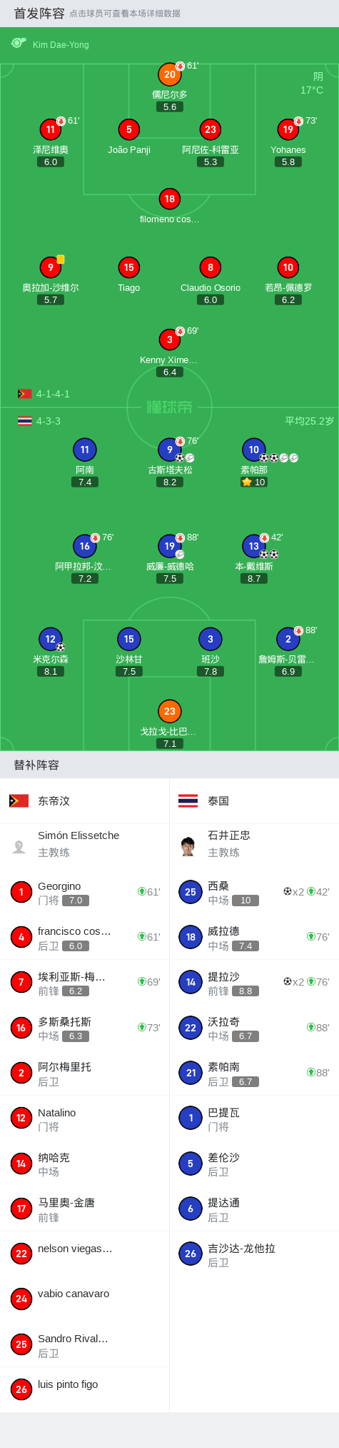 泰国10-0血洗东帝汶,提拉沙双响,西桑两球