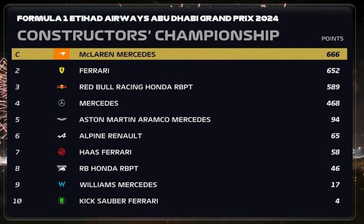 北京时间12月8日,F1阿布扎比大奖赛正赛结束。迈凯伦车队以666分加冕车队总冠军,这也是车队继1998年夺冠后,再一次夺得车队总冠军,而法拉利车队则以652分收获亚军。