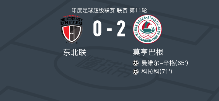 在印度足球超级联赛第11轮的比赛中,东北联坐镇主场迎战莫亨巴根。比赛中,莫亨巴根的阿西什-拉伊表现出色,先后为队友曼维尔-辛格和科拉科送出助攻,帮助球队取得两粒进球。最终,莫亨巴根以2比0战胜东北联,取得了本场比赛的胜利。