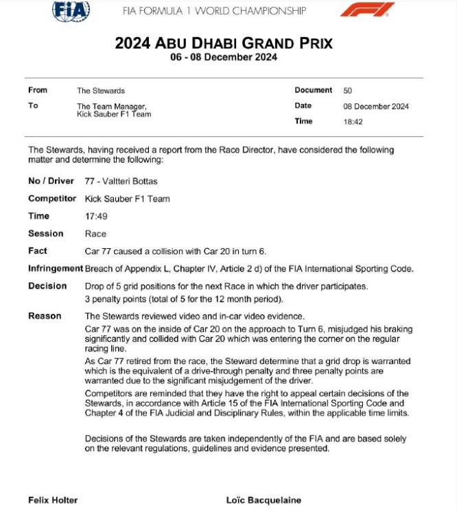 赛后,F1官方报告,博塔斯因引发与马格努森的碰撞,被罚下一场比赛退后5位发车,同时超级驾照扣3分。