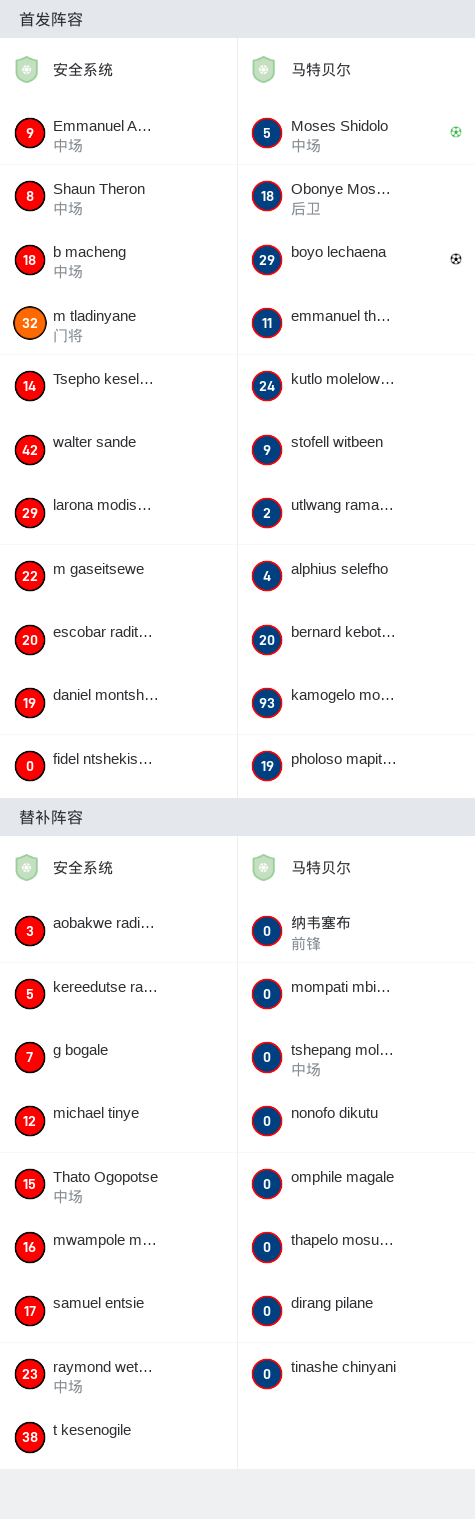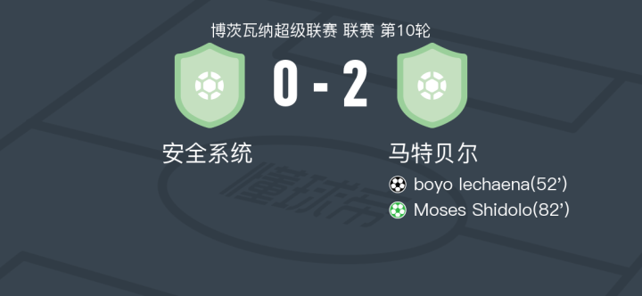 在博茨瓦纳超级联赛第10轮的较量中,安全系统坐镇主场迎战马特贝尔。比赛中,马特贝尔的boyo lechaena率先为球队打破僵局,随后Moses Shidolo通过点球机会再下一城。最终,马特贝尔以2比0战胜安全系统,取得了本场比赛的胜利。